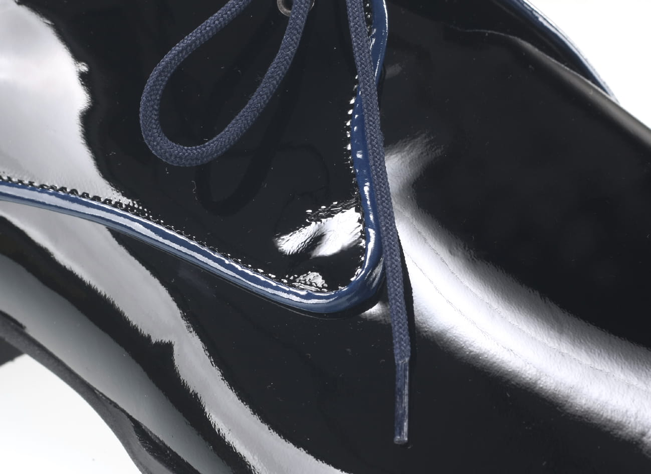 Obuwie wykonano z miękkich skór lakierowanej z dodatkiem niebieskiej lakierowej lamówki