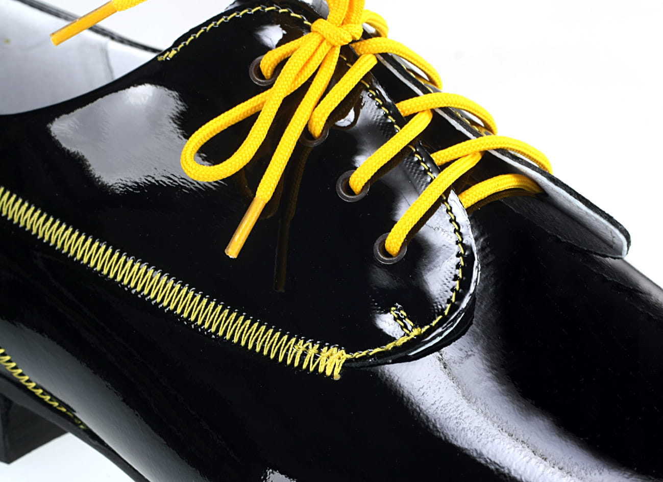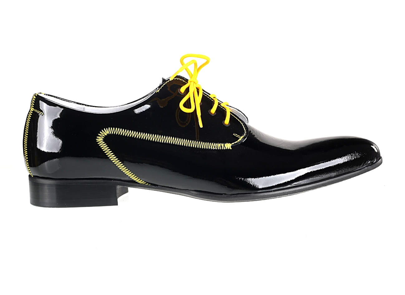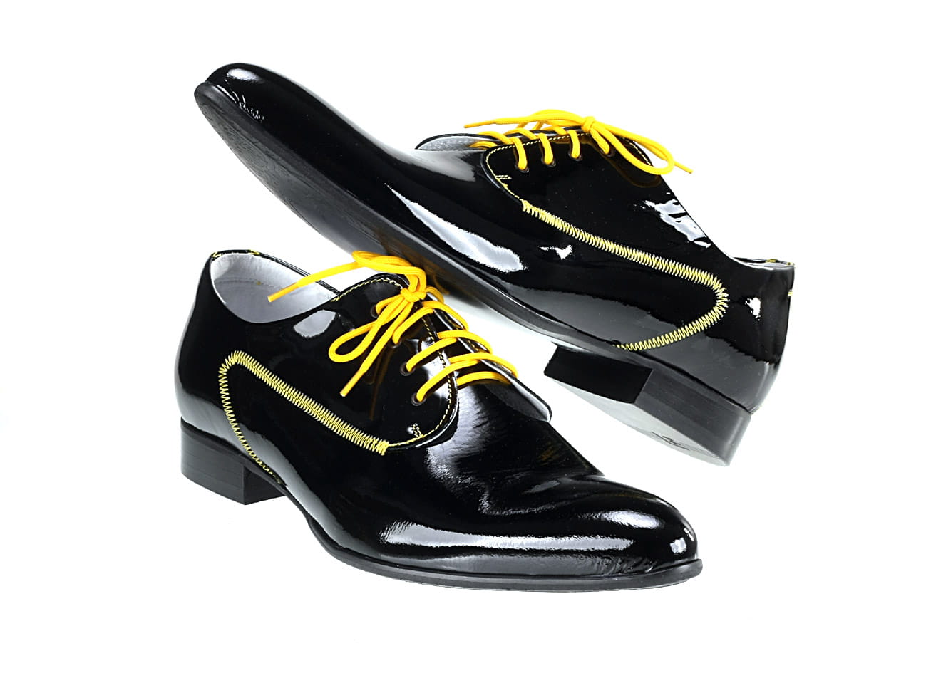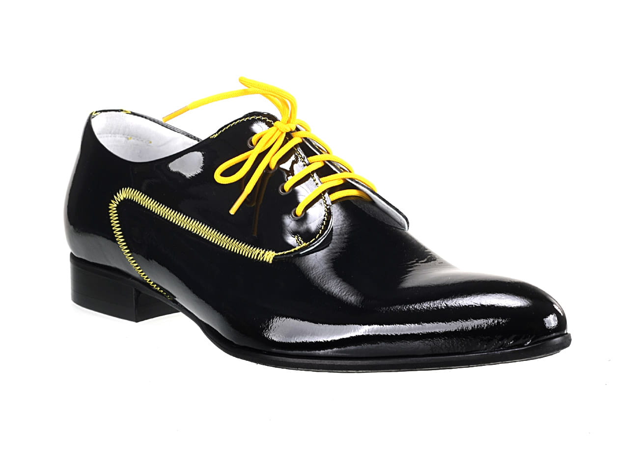 Obuwie sznurowane, wykonane ze skóry bydlęcej- lakierowanej,z dodatkiem żółtej nitki
