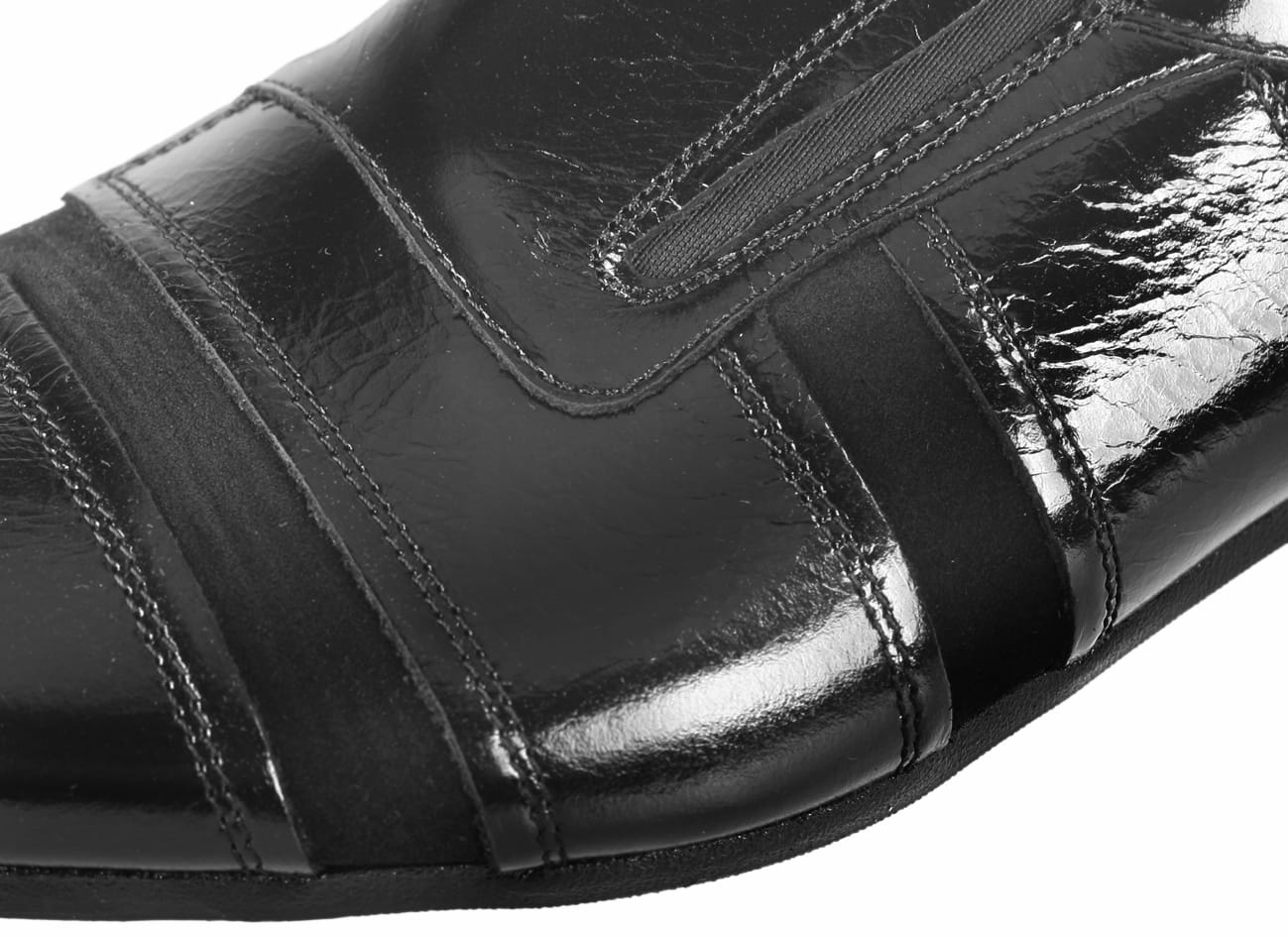 Model wsuwany z gumką po bokach, która zapewnia wygodne ubieranie i dopasowanie do stopy, wykonane ze skóry typu zamsz połączonej ze skórą licową.