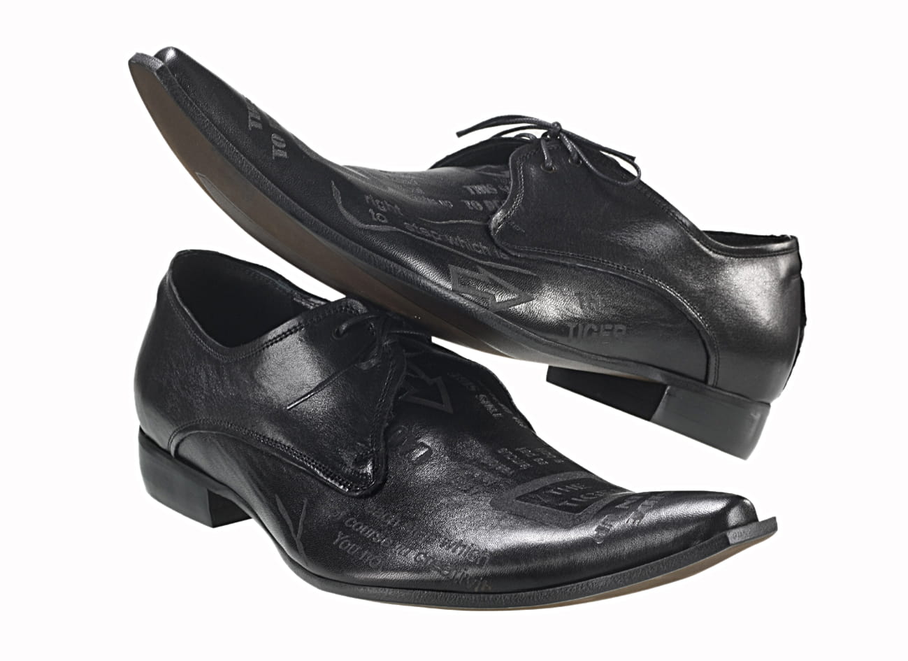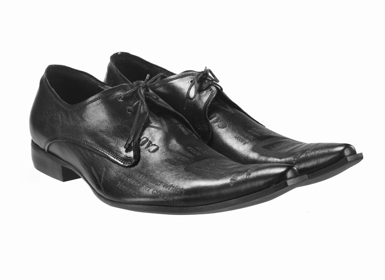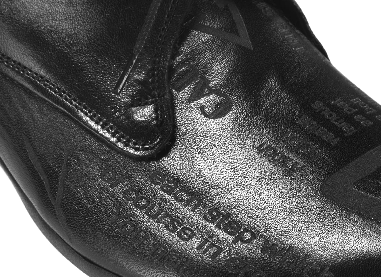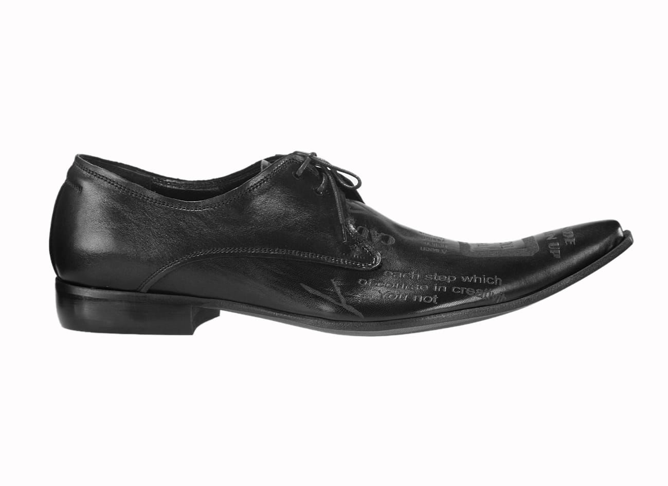 Obuwie buty półbuty wizytowe odważne szpic sznurowane czarne skórkowe litery