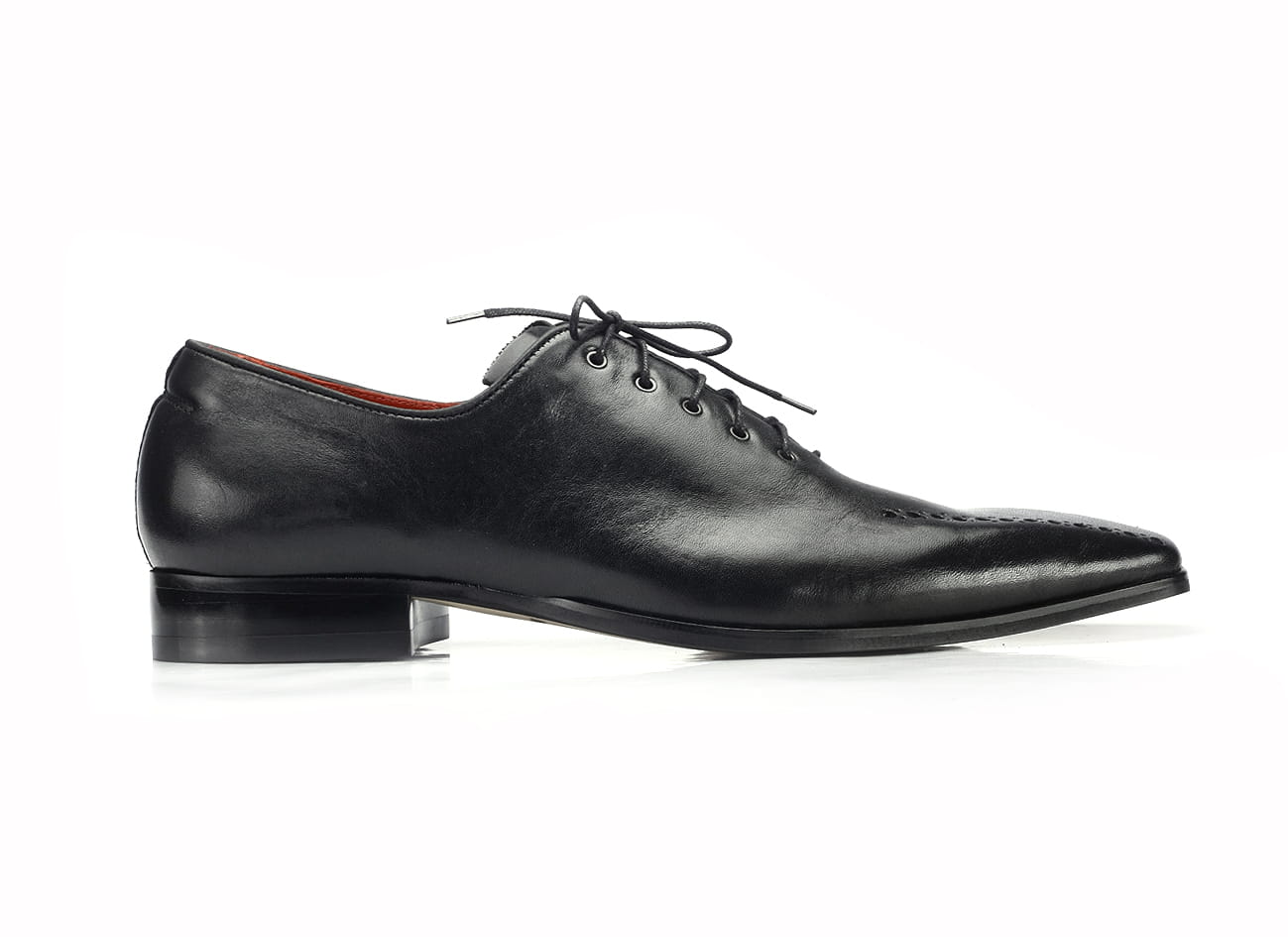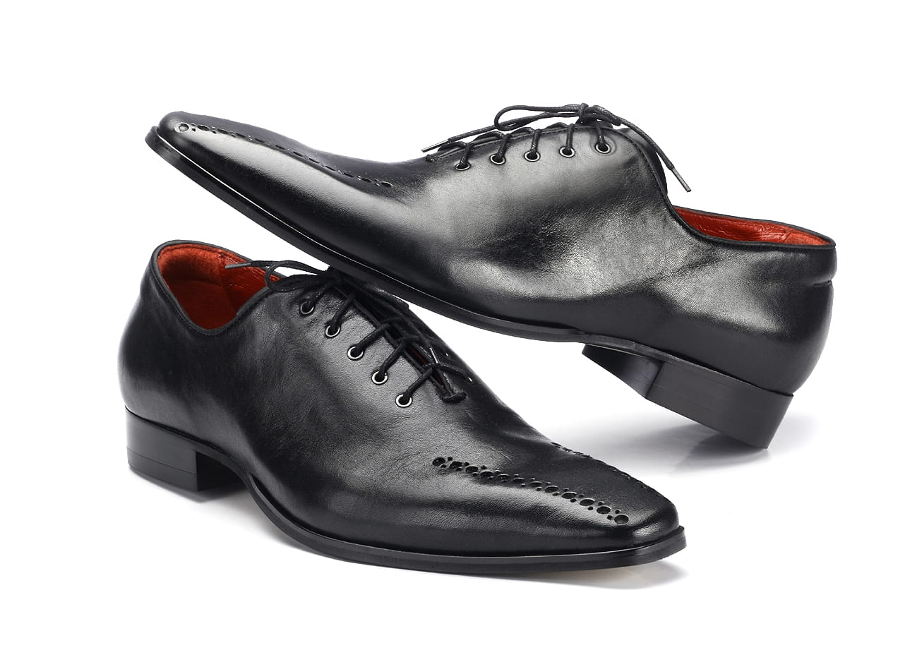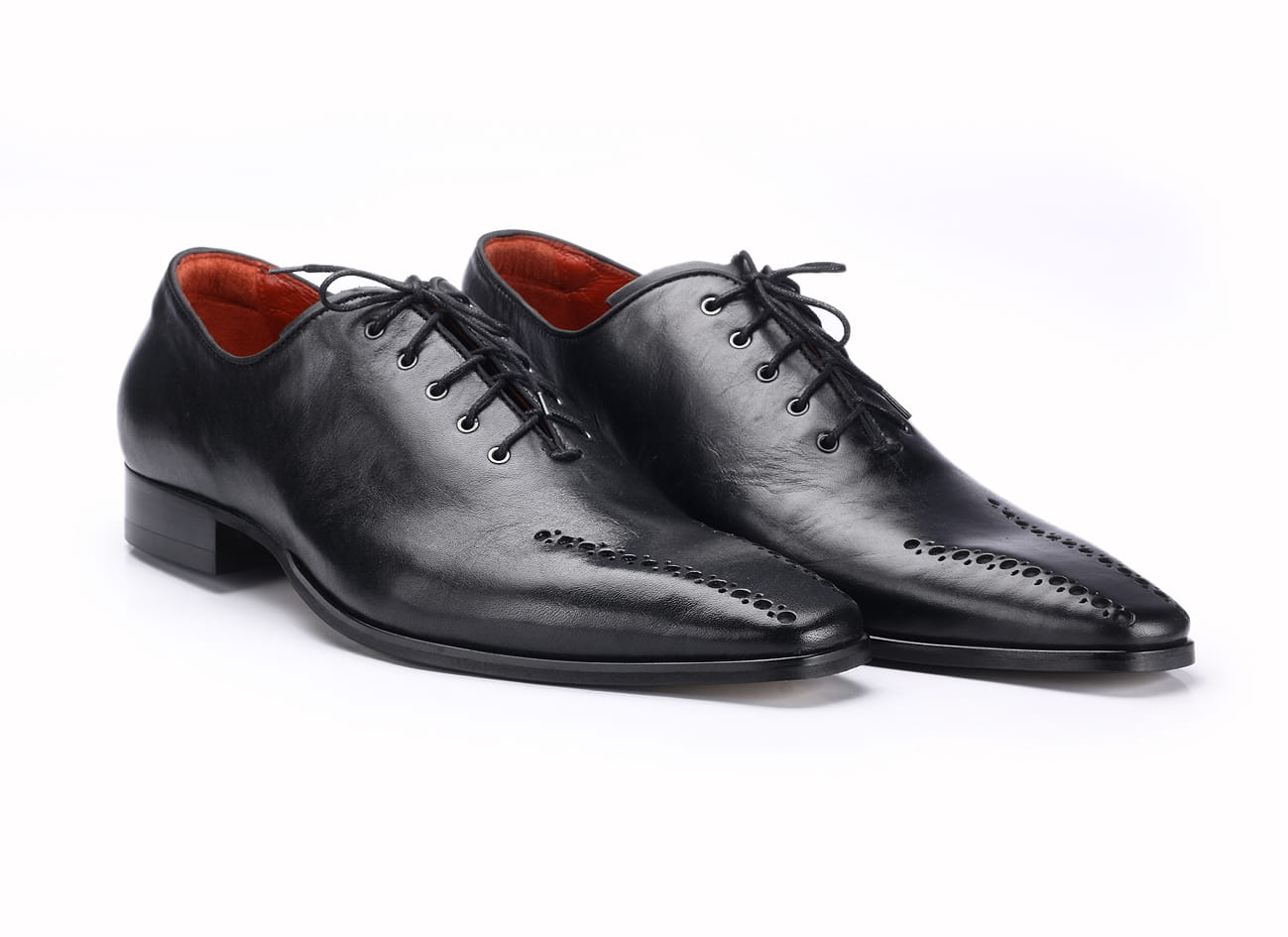Wizytowe obuwie buty półbuty męskie czarne sznurowane skórkowe zdobienia haft