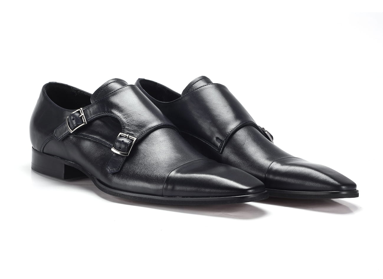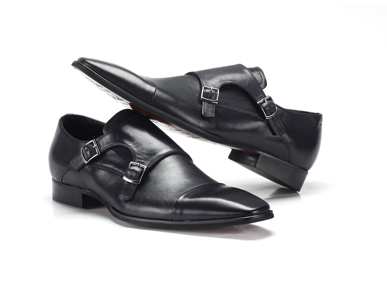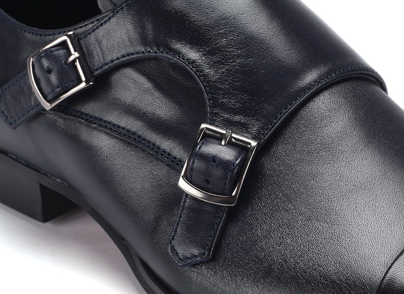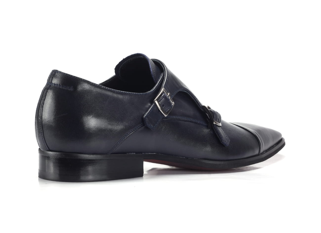 Wizytowe obuwie półbuty buty męskie skórzane sprzączki wsuwane granatowe wyższy obcas personalizacja obuwia grawer na podeszwie