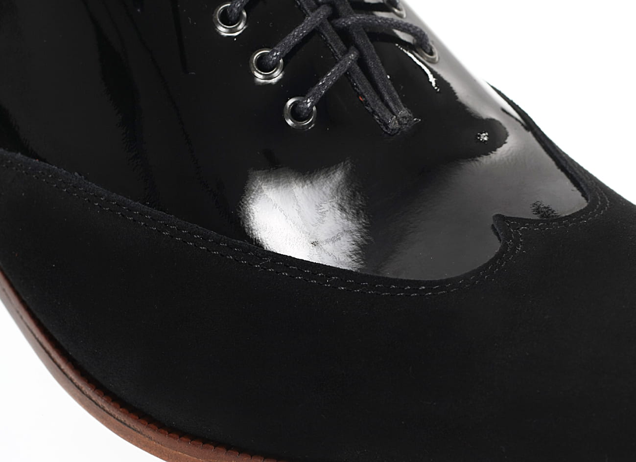 Obuwie sznurowane, wykonane z miękkich skór bydlęcych typu lakier zamsz