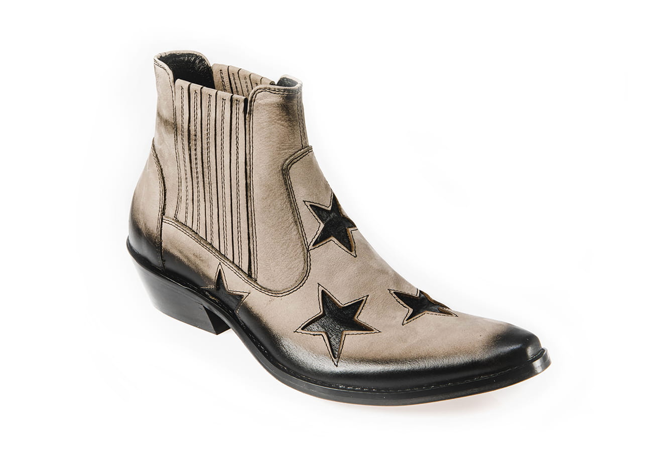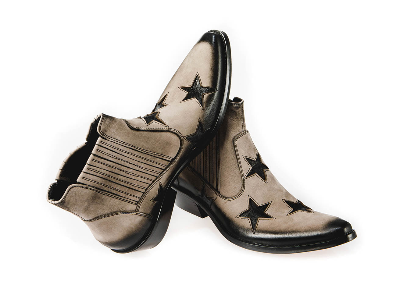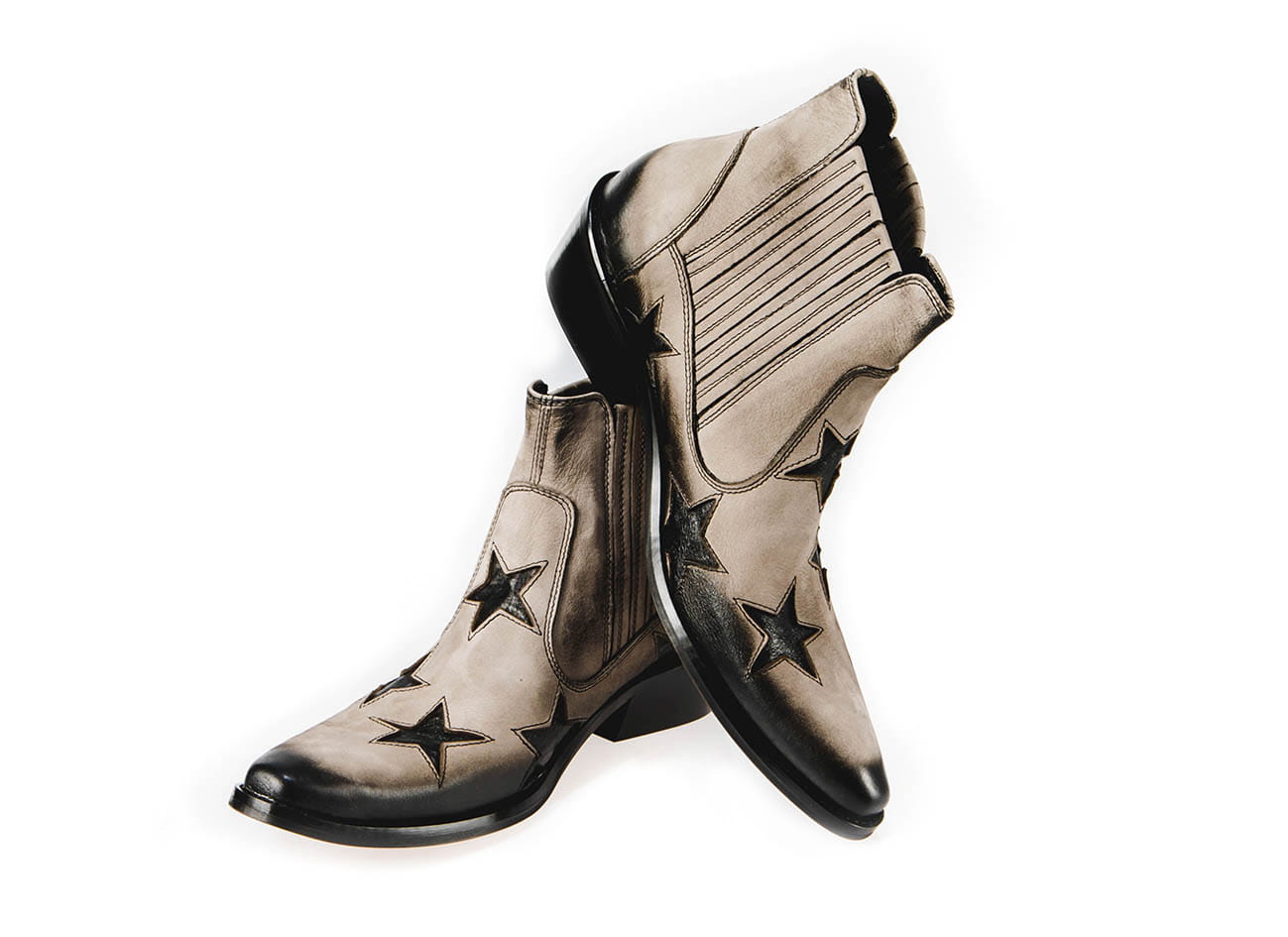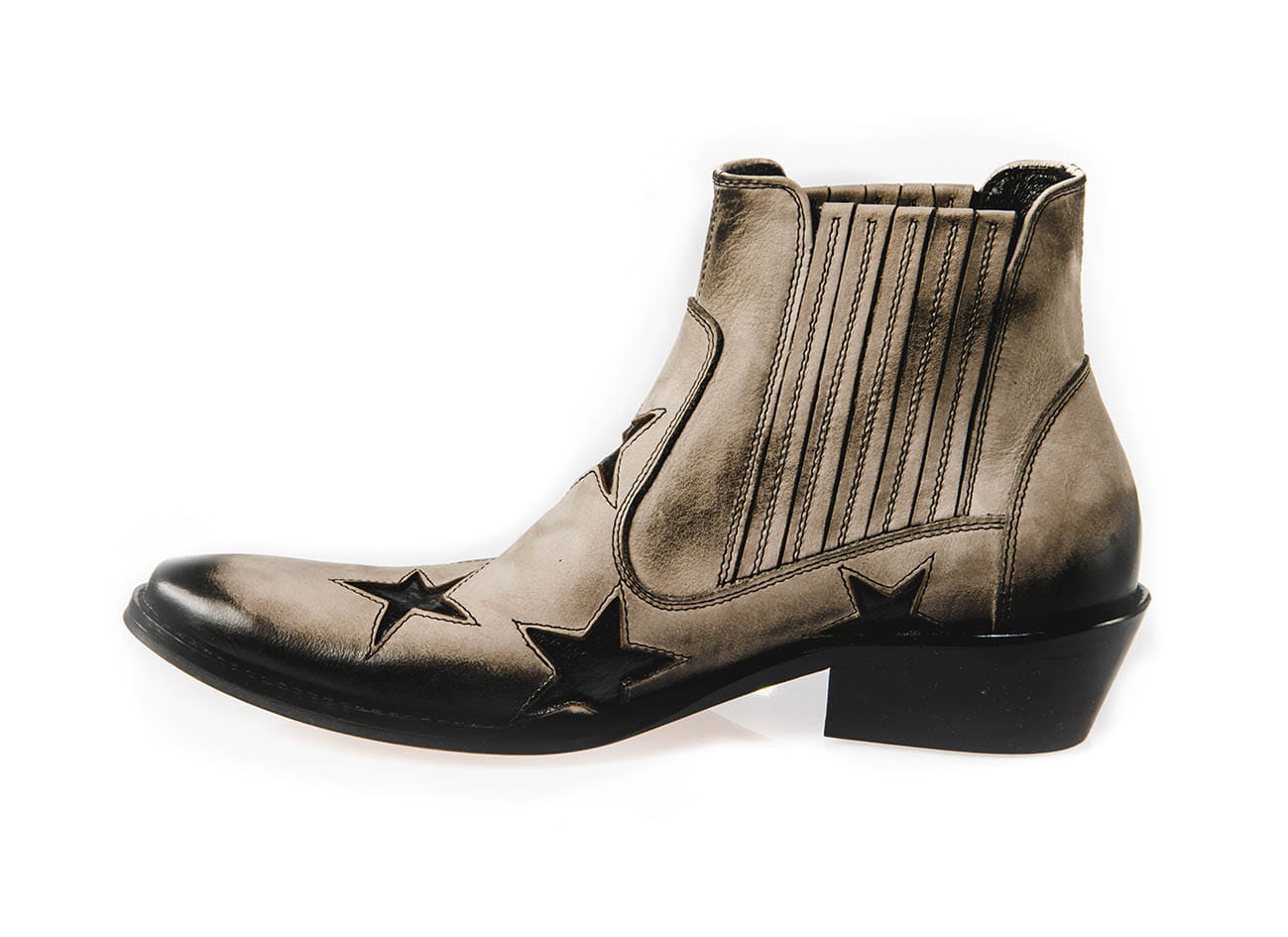 Model wsuwany z gumką po bokach zapewniającą wygodne ubieranie i dopasowanie do stopy. Całkowita długość cholewy wraz z obcasem to 17 cm, a jej szerokość u samej góry to 13 cm. Obuwie wykonane ze skóry naturalnej bydlęcej przecieranej.