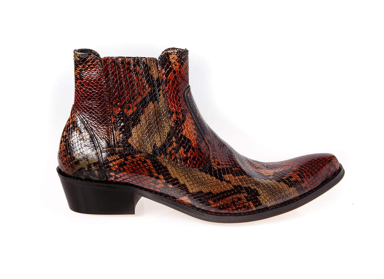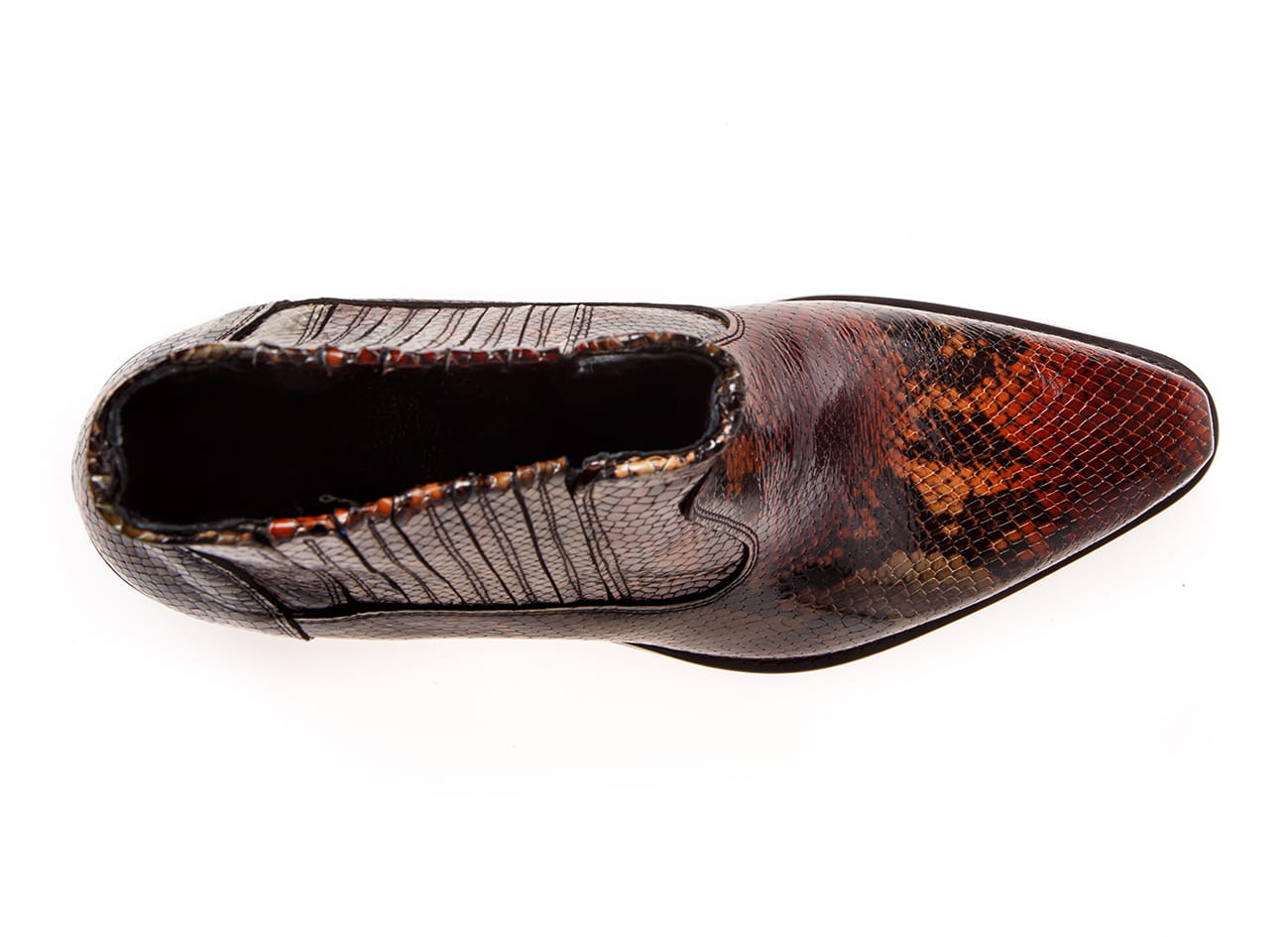 Model wsuwany z gumką po bokach zapewniającą wygodne ubieranie i dopasowanie do stopy. Całkowita długość cholewy wraz z obcasem to 17 cm, a jej szerokość u samej góry to 13 cm. Obuwie wykonane ze skóry naturalnej ręcznie malowanej.