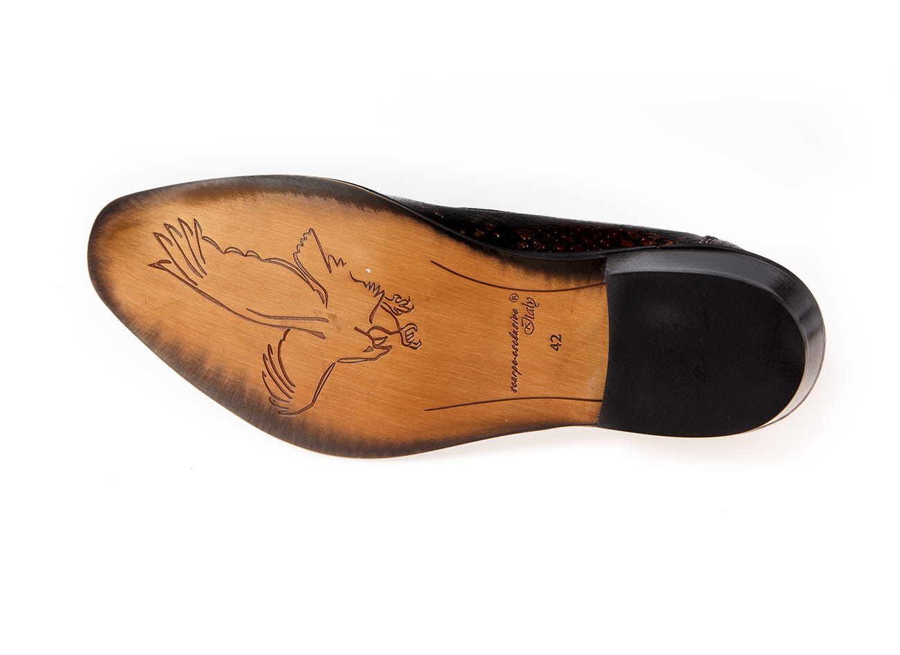 Pogrubiona podeszwa, przeszyta kiedra spodu, zadarty do góry nosek, obszyta skórą guma itd. gwarantują niepowtarzalną jakość.