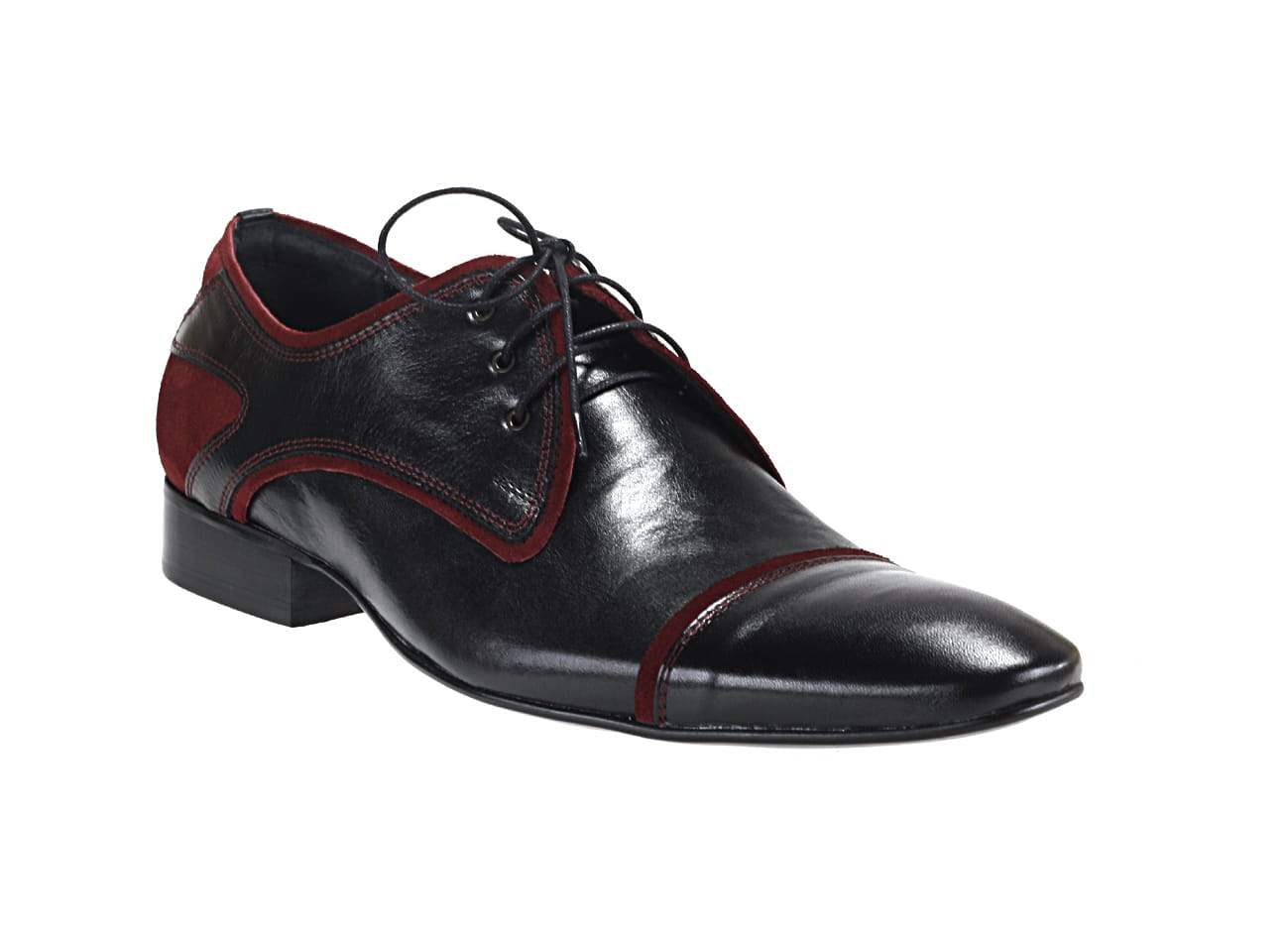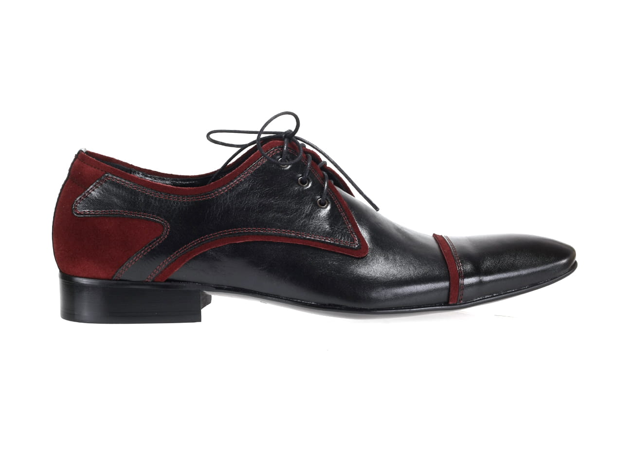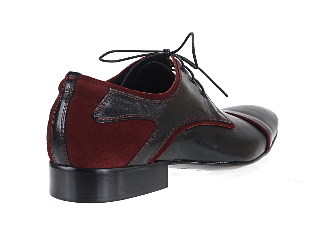 Włoskie obuwie sznurowane skóra bordowe wiśnia wizytowe męskie wiedenki derby [MODEL: 938-01-12 Nero euro/maroon camoscio]