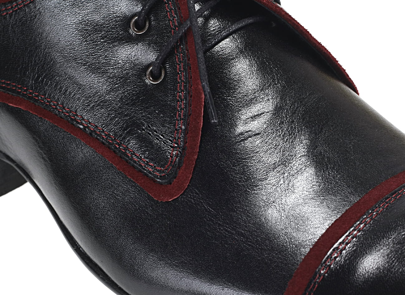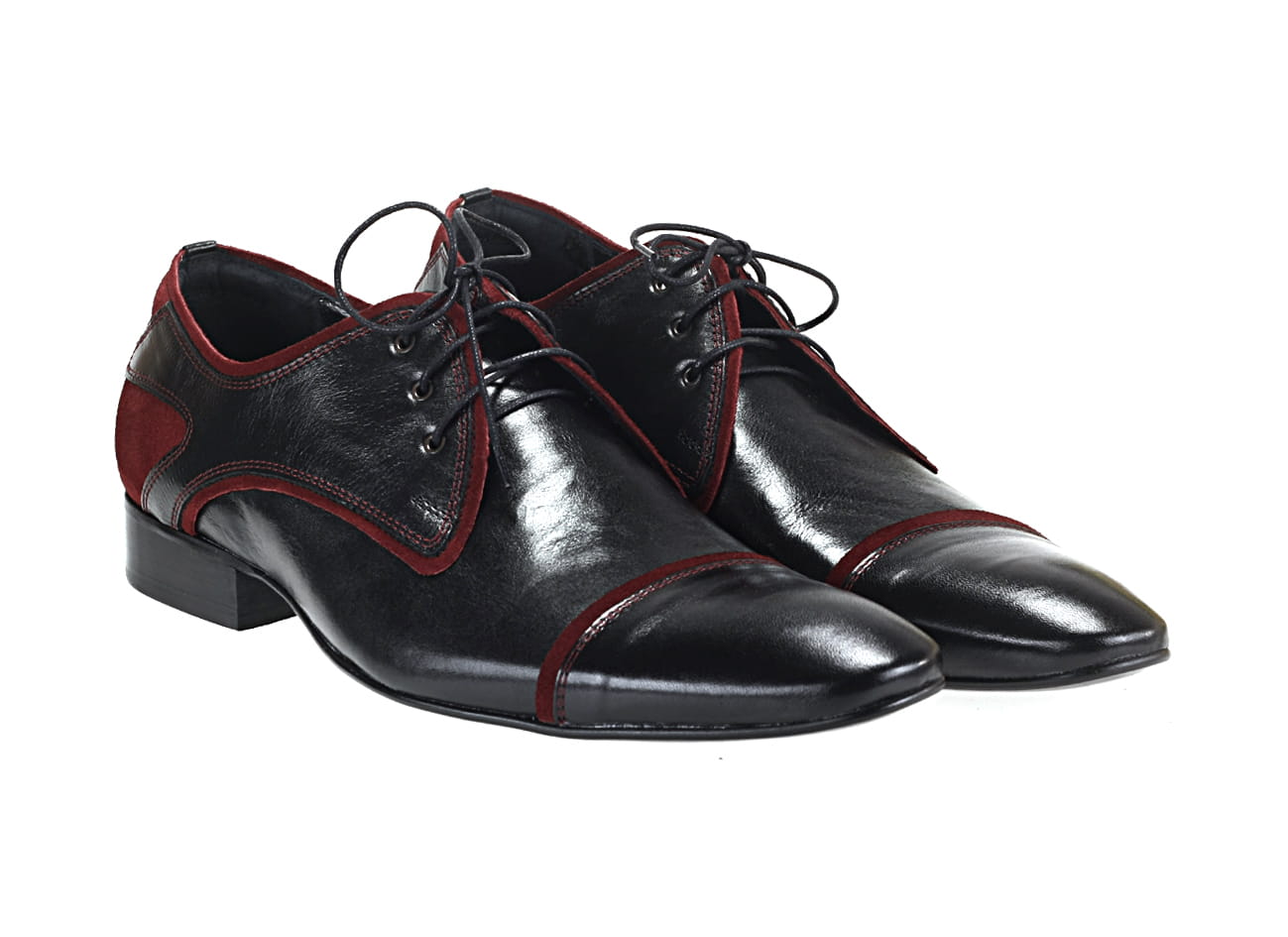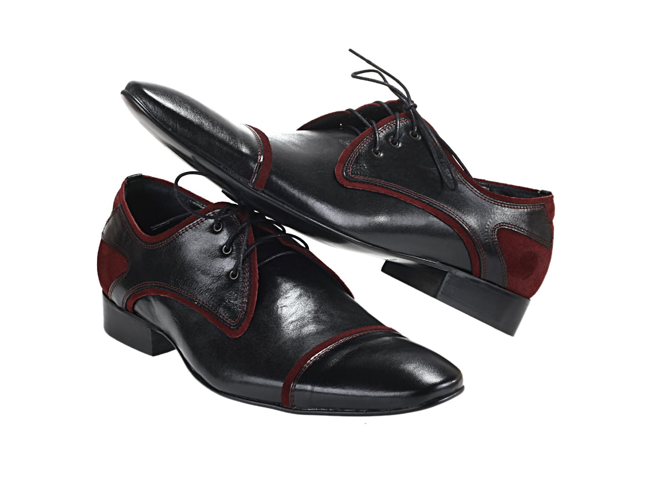 Włoskie obuwie sznurowane skóra bordowe wiśnia wizytowe męskie wiedenki derby [MODEL: 938-01-12 Nero euro/maroon camoscio]