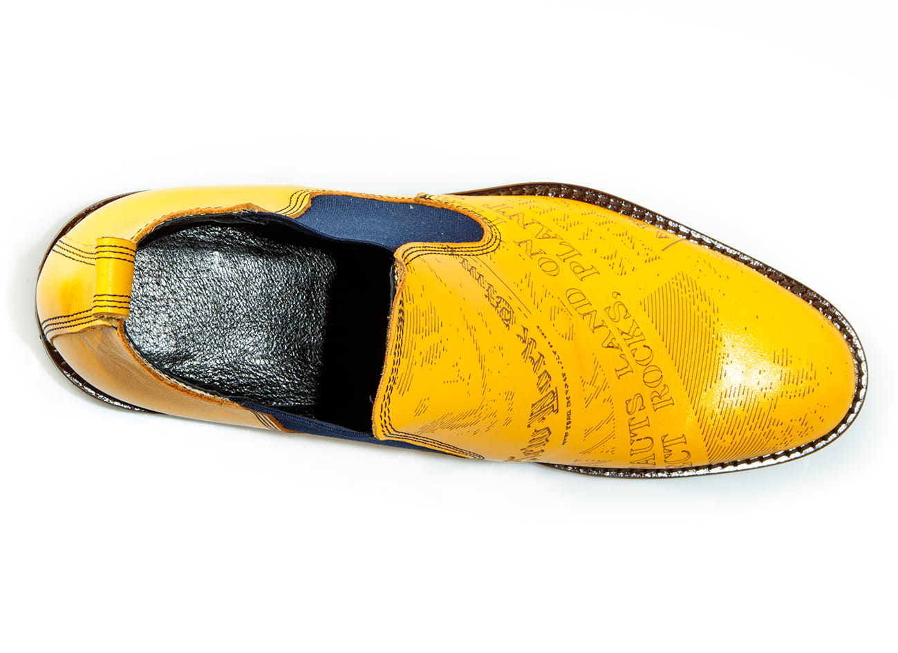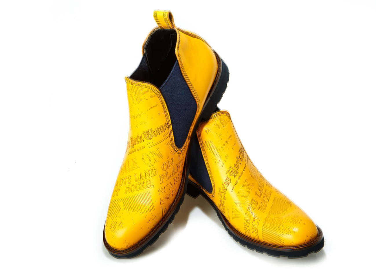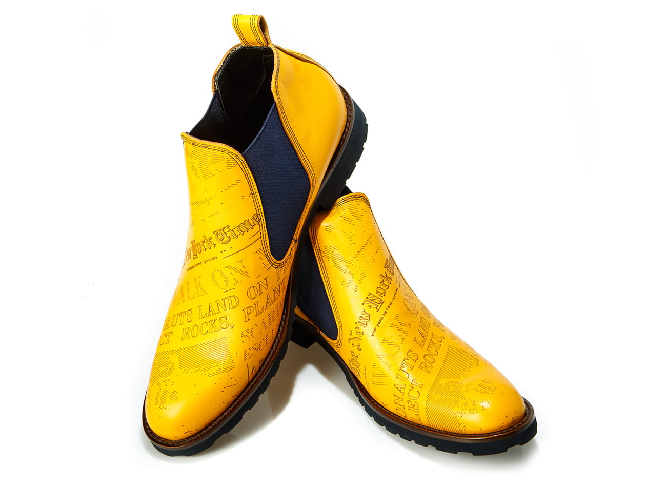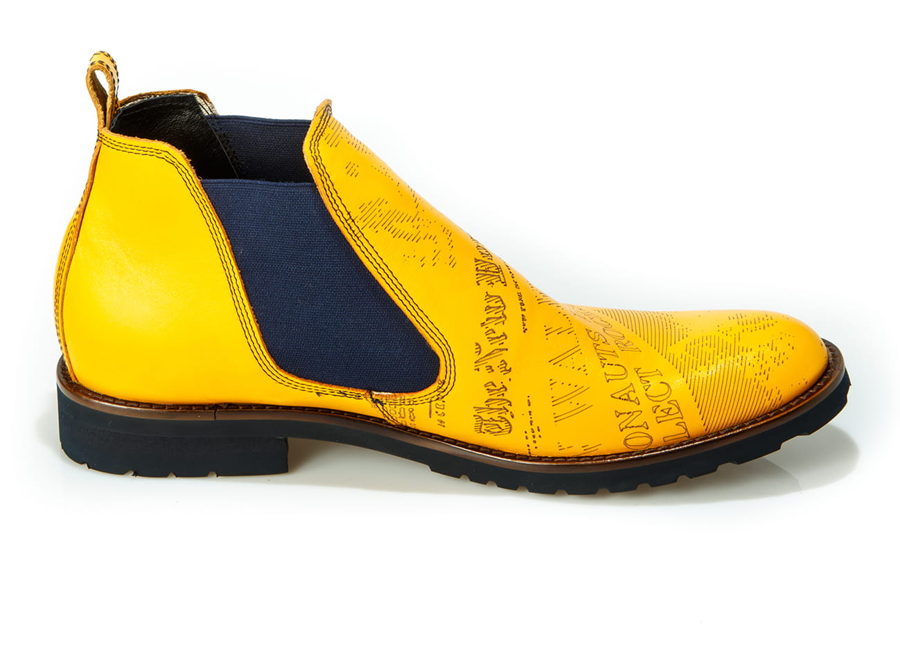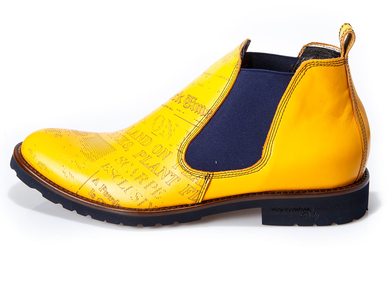 Wsuwane botki męskie skórzane żółte litery gazeta odważne półbuty casual buty do kostki man’s shoes buty kolorowe unikat sztyblety