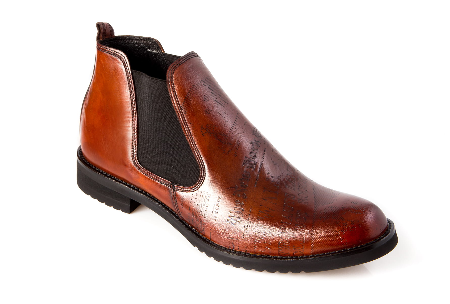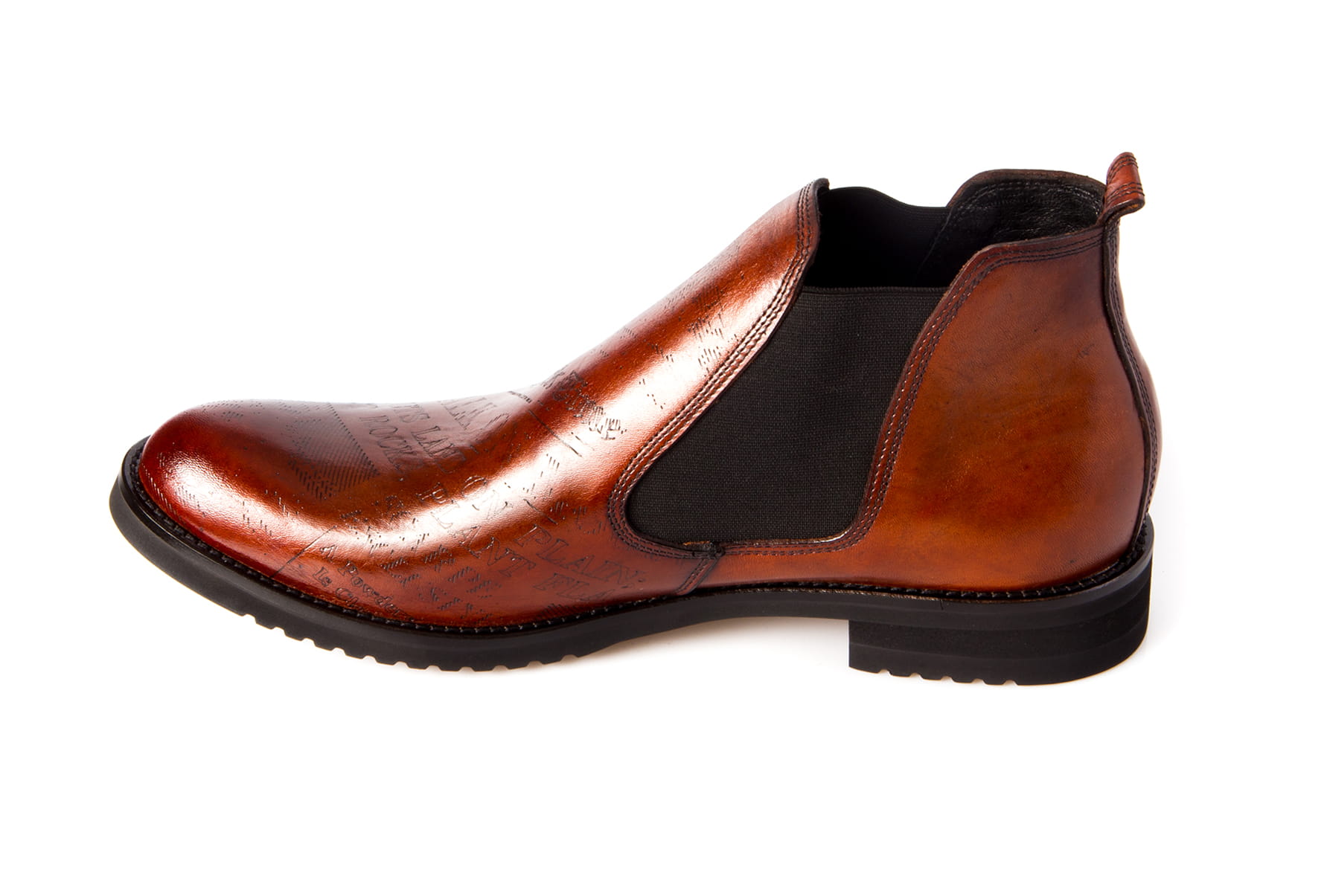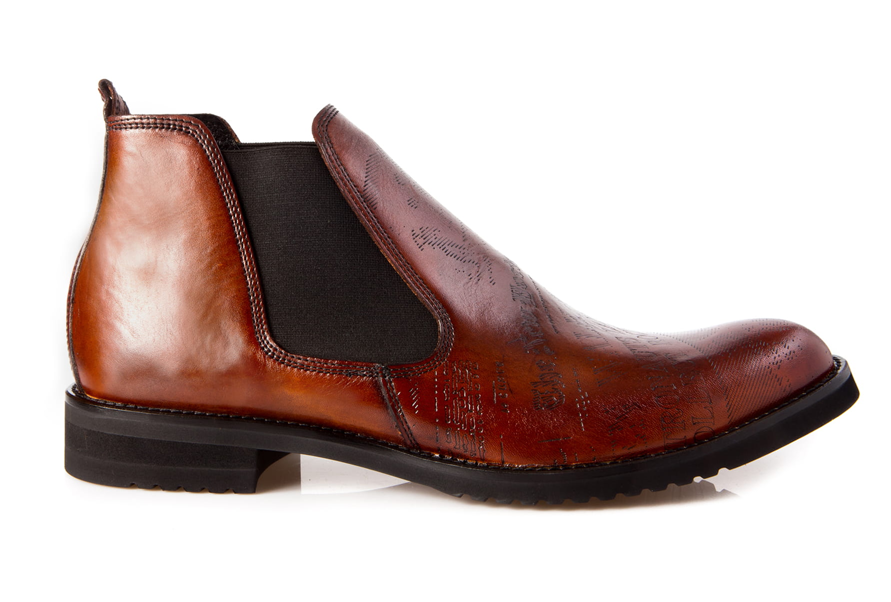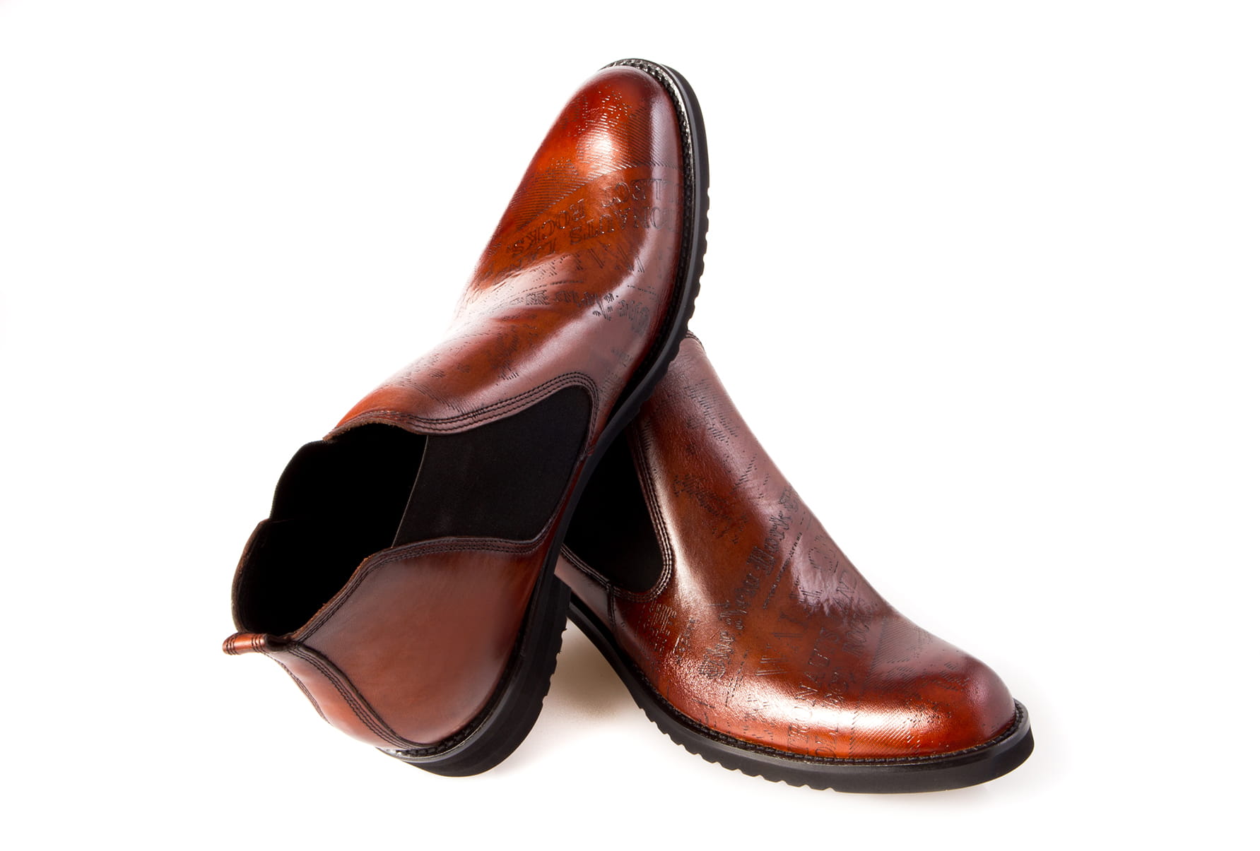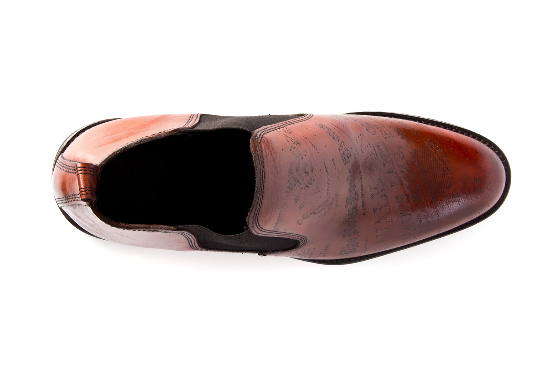 Obuwie wykonane z najwyższej jakości miękkiej skóry bydlęcej z wylaserowanymi wzorami i literami (typu gazeta) skóra ręcznie malowana